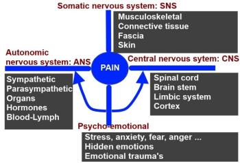 - Het centraal zenuwstelsel met het ruggenmerg, hersenstam, limbisch systeem en cortex. Want zonder hoofd hebben we geen pijn, niet fysiek en niet emotioneel